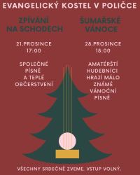 V evangelickém sboru máme rádi hudbu. Ve 4. adventí neděli 21. prosince budeme pře kostelem na schodech zpívat známé adventní a vánoční písně. V neděli 28. prosince vás zveme na koncert Šumařské vánoce od 18 hodin v kostele.